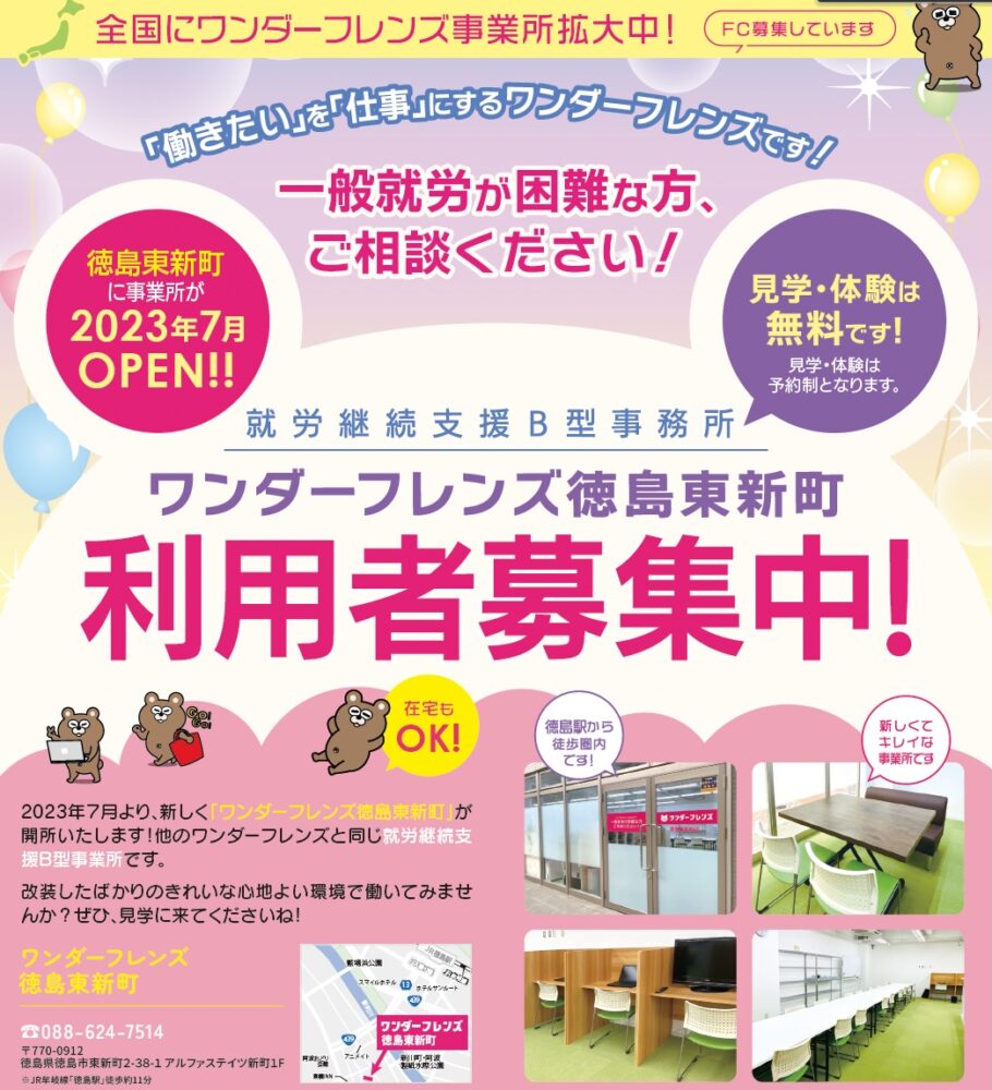 2023年7月より、新しく「ワンダーフレンズ徳島東新町」が開所いたします!他のワンダーフレンズと同じ就労継続支援B型事業所です。