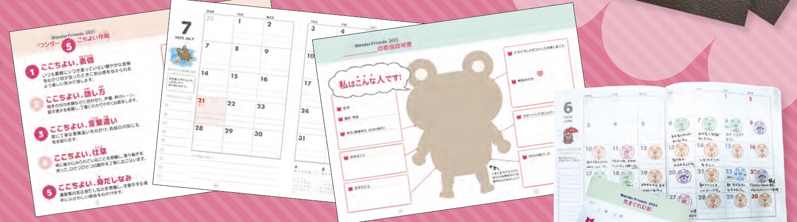 毎日の体調をスタンプやシールで楽しく記録できるカレンダーや、ワンダーフレンズが大切にしている想い・ルール・豆知識、自分の「取扱説明書」まで、盛りだくさんの内容が詰まっています。