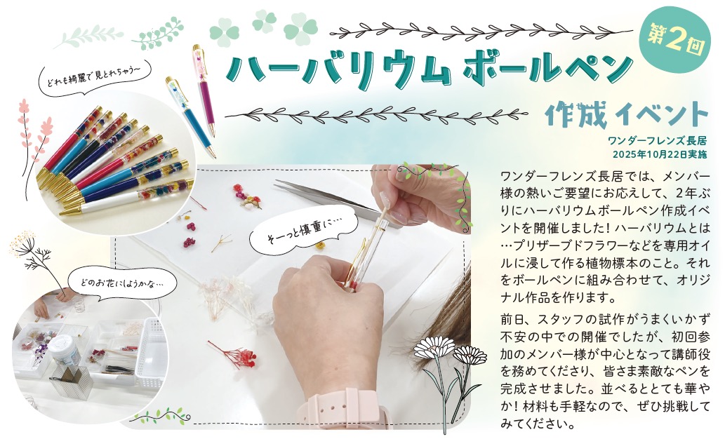 就労継続支援B型事業所ワンダーフレンズ長居では、メンバー様の熱いご要望にお応えして、2年ぶりにハーバリウムボールペン作成イベントを開催しました!